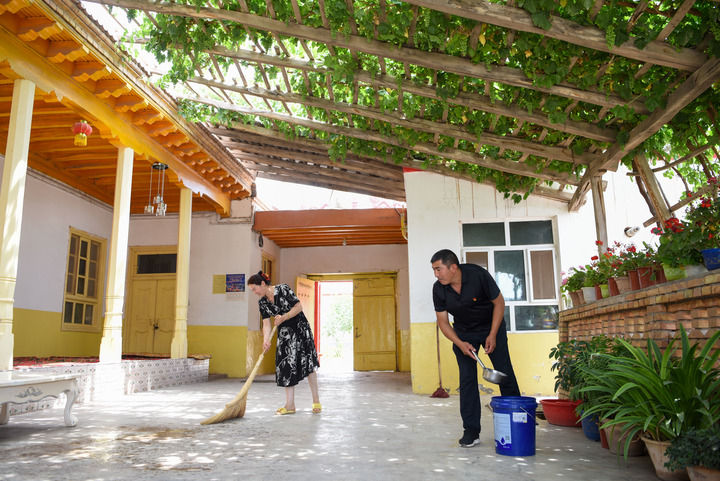 在新疆喀什地区疏附县阿亚格曼干村,村民阿卜都克尤木·肉孜(右)和妻子在打扫庭院(2022年6月10日摄)