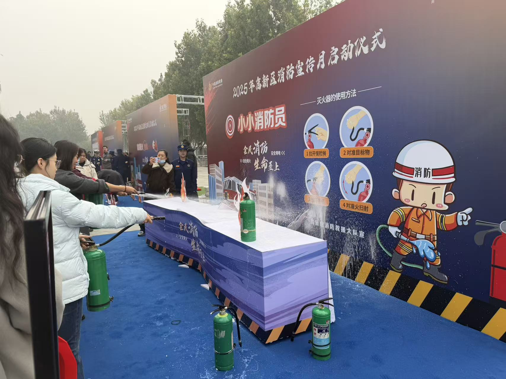 现场还设置了消防互动区域,包含打消防绳结、消防版套圈、有奖答题、水带打保龄球、小小消防员等趣味项目,在互动中学习消防知识。